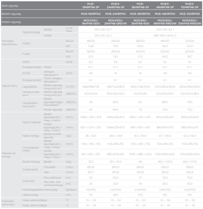 A Midea MUE-18HRFN8-SP parapet-mennyezeti split (R32, 5,3 kW) fontos tulajdonságai: