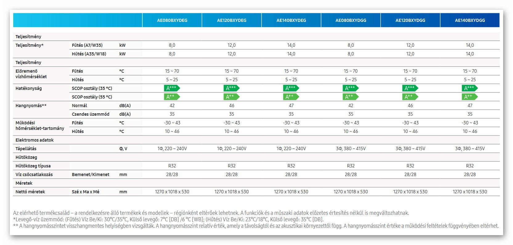 A Samsung AE140BXYDGG Monoblokk High Temperature hőszivattyú (R32, 14kW, 3 fázis) fontos tulajdonságai: